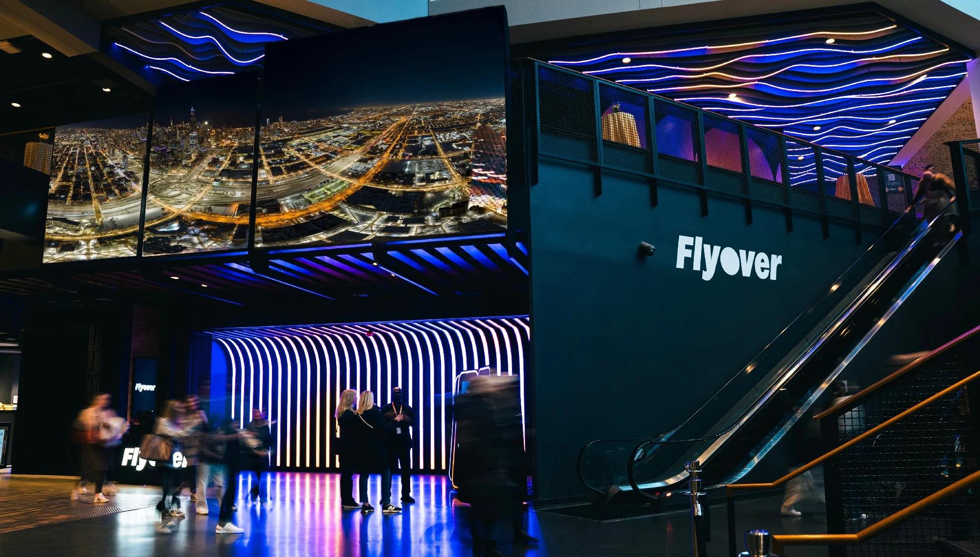 Flyover is an immersive flying theater in Chicago that simulates soaring over the city’s landmarks. You sit suspended, feet dangling, in motion seats before a 65-foot spherical screen, with wind, mist, and scent effects that make the sensation of flight feel incredibly real.